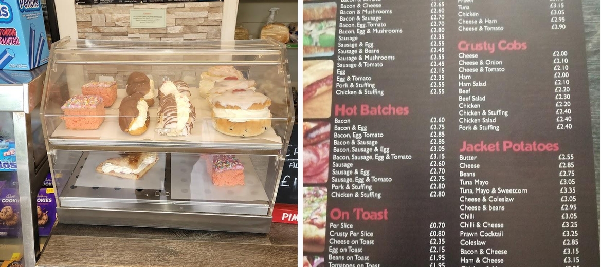 This is a great cafe. You order from from the vast menu and get handed an even bigger sandwich. If you want a filling lunch then order a baguette. It will be enough for a second meal. Crusty bread is door step sized and there are vegan options. For kids there are sweets too. The best thing is the price. If you want a bargain around £3.00, then no one seems able to match it. Point to note, jacket potato is swimming in butter so ask for a small amount of butter.